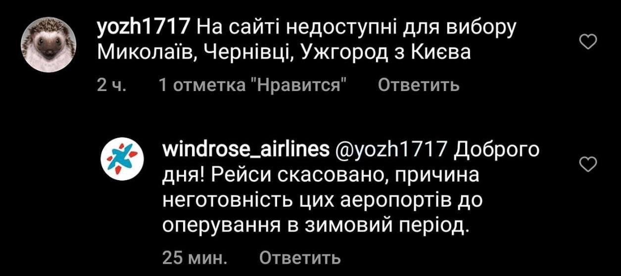 В частности, пользователи группы «Авиация Украины» начали интересоваться, почему компания «Windrose Airlines» убрала из зимнего расписания полеты из аэропортов Черновцов, Ужгорода, Николаева и Херсона.