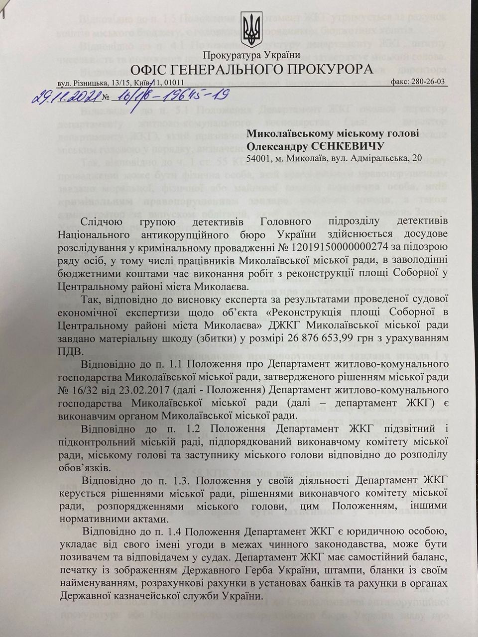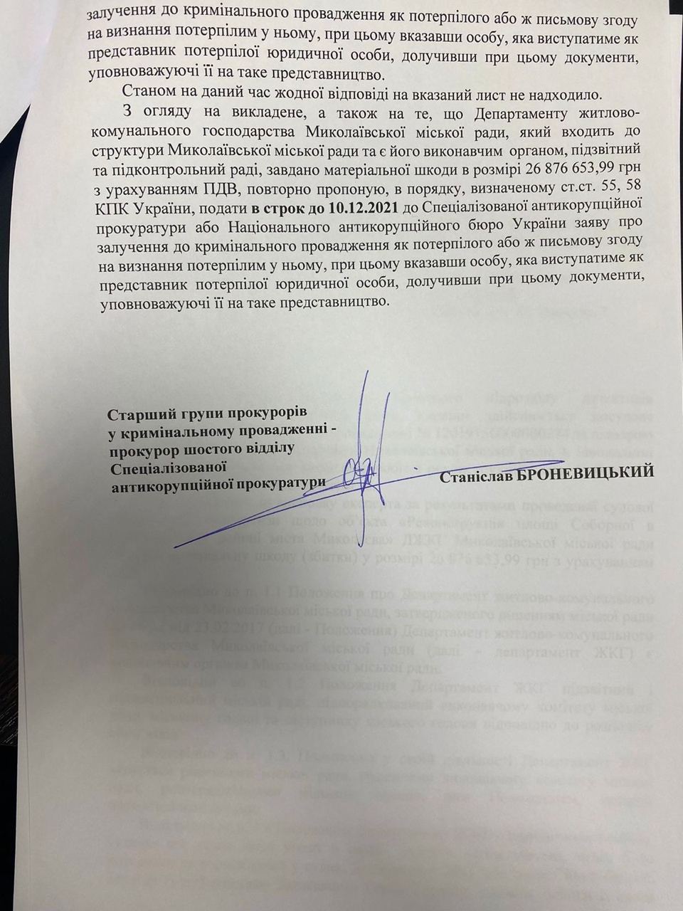 Специализированная антикоррупционная прокуратура направила в мэрию Николаева несколько писем с просьбой признать Департамент жилищно-коммунального хозяйства потерпевшей стороной по делу о Соборной площади.