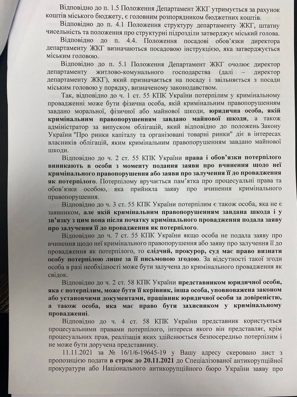 В данном случае, следствие считает, что Департаменту был нанесен материальный ущерб в сумме 26,8 миллиона гривен, а потому просит мэрию подать соответствующее заявление или письменное согласие.