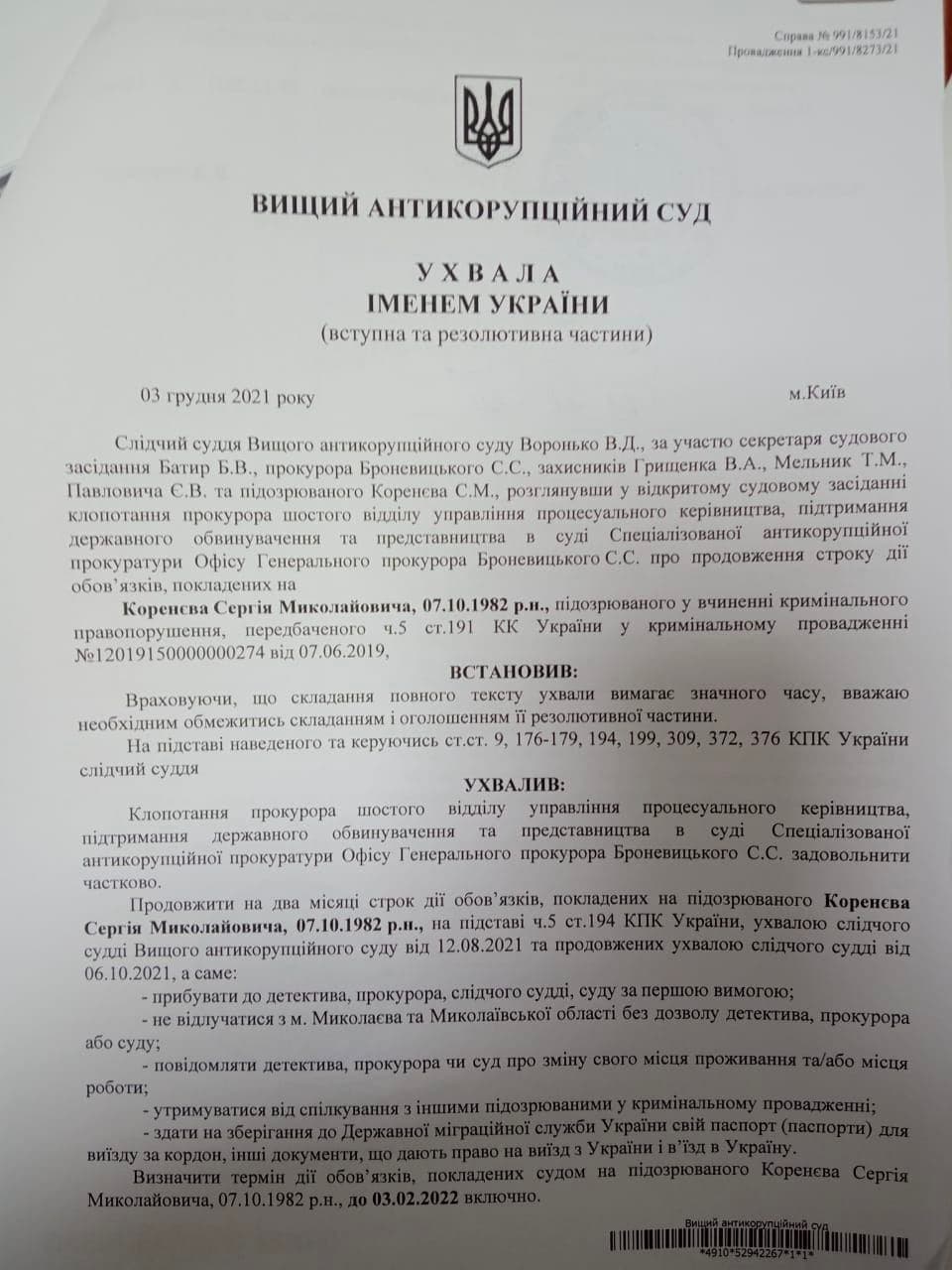 Высший антикоррупционный суд продлил до 3 февраля 2022 года срок действия обязательств, возложенных на заместителя городского головы Николаева Сергея Коренева и заместителя директора Департамента ЖКХ Александра Брыжатого по делу о реконструкции Соборной площади в Николаеве.
