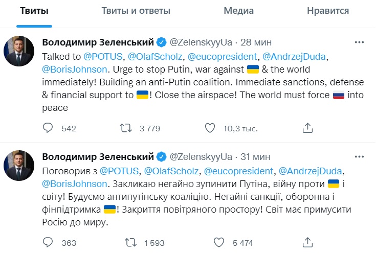 — Призываю немедленно остановить Путина, войну против Украины и мира! Строим антипутинскую коалицию. Немедленные санкции, оборонная и финподдержка Украины! Закрытие воздушного пространства! Мир должен ппринудить Россию к миру, — написал президент.