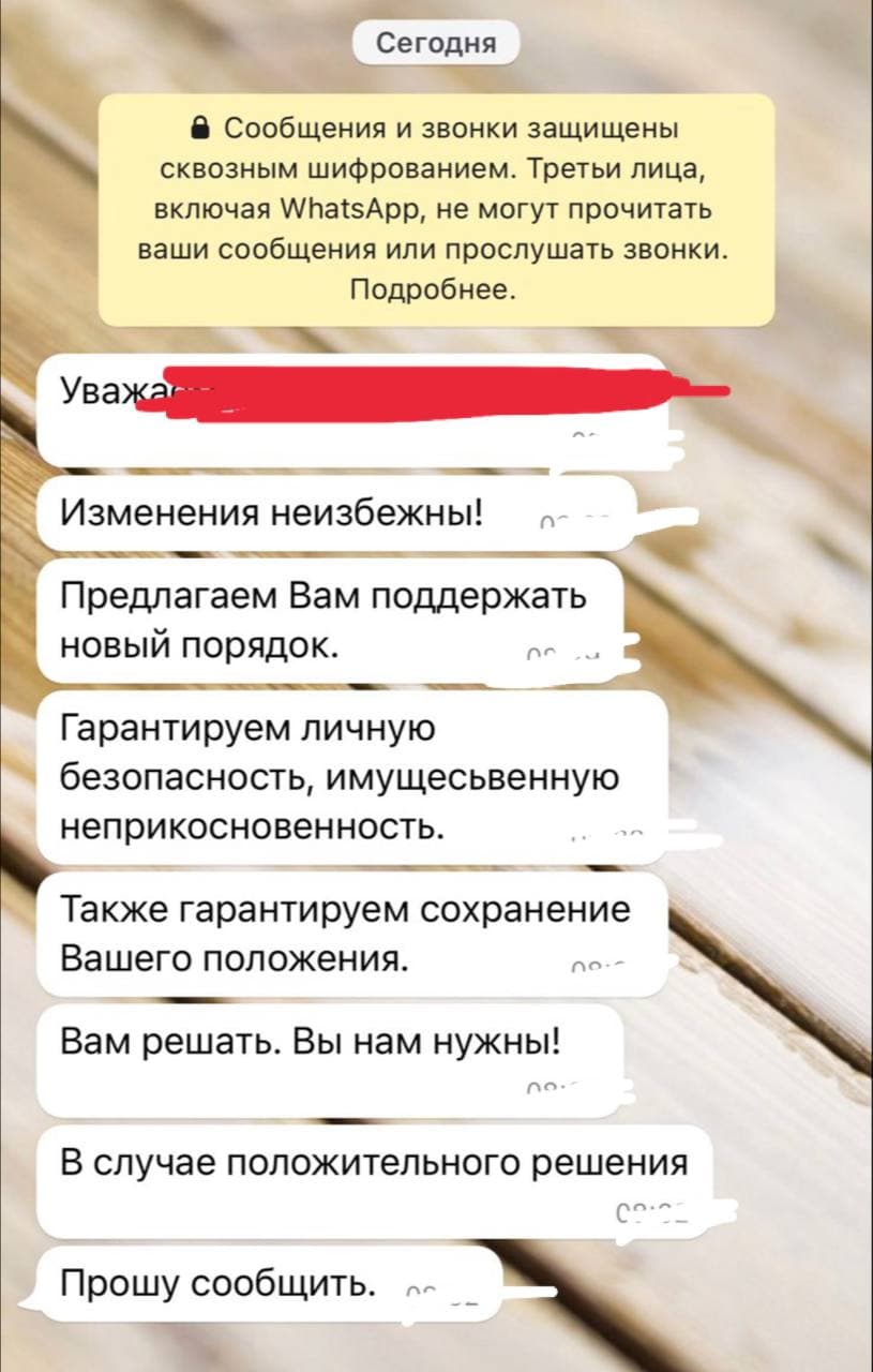 «Изменения неизбежны. Предлагаем вам поддержать новый порядок. Гарантируем личную безопасность, имущественную неприкосновенность. Также гарантируем сохранение Вашего положения. Вам решать. Вы нам нужны. В случае положительного решения, прошу сообщить», — говорится в сообщениях.