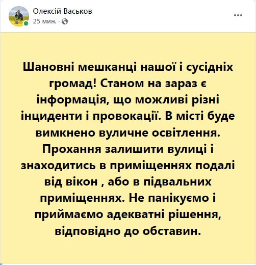 — Мы получили информацию про авиаудар. Планомерно перемещайтесь в бомбоубежища и подвалы. Возьмите с собой воду, документы, все необходимое. Ни в коем случае не выходите на крыши домов и на улицу, – сказал мэр.