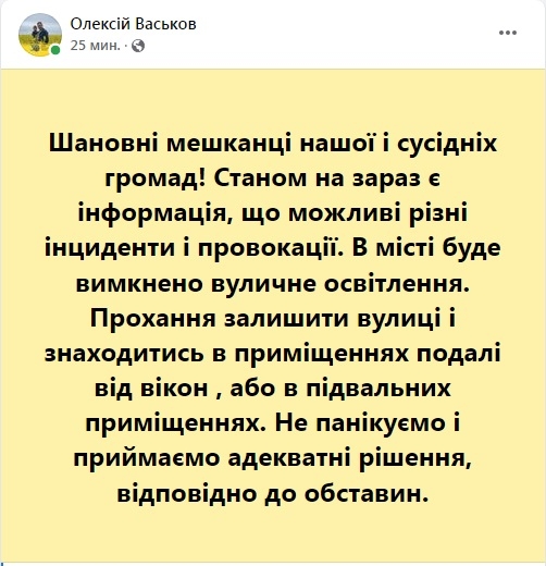 Глава облгосадминистрации Виталий Коваль призывает людей найти вблизи домов безопасные места для укрытия. Других подробностей пока нет.