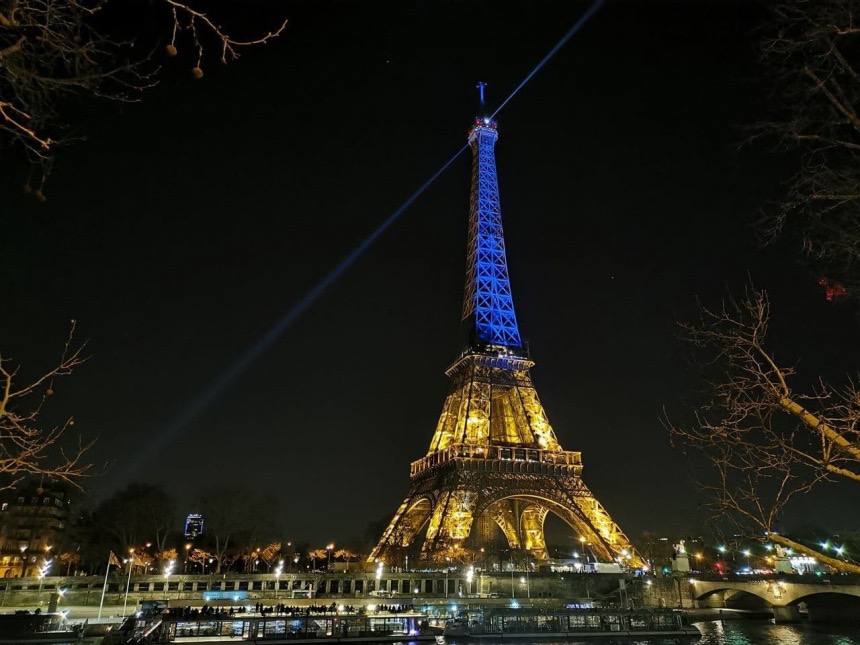 Эйфелеву башню в Париже подсветили синим и желтым цветом в знак поддержки Украины, сообщил постпред Франции при ООН Николя де Ривьер.