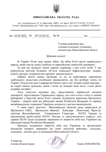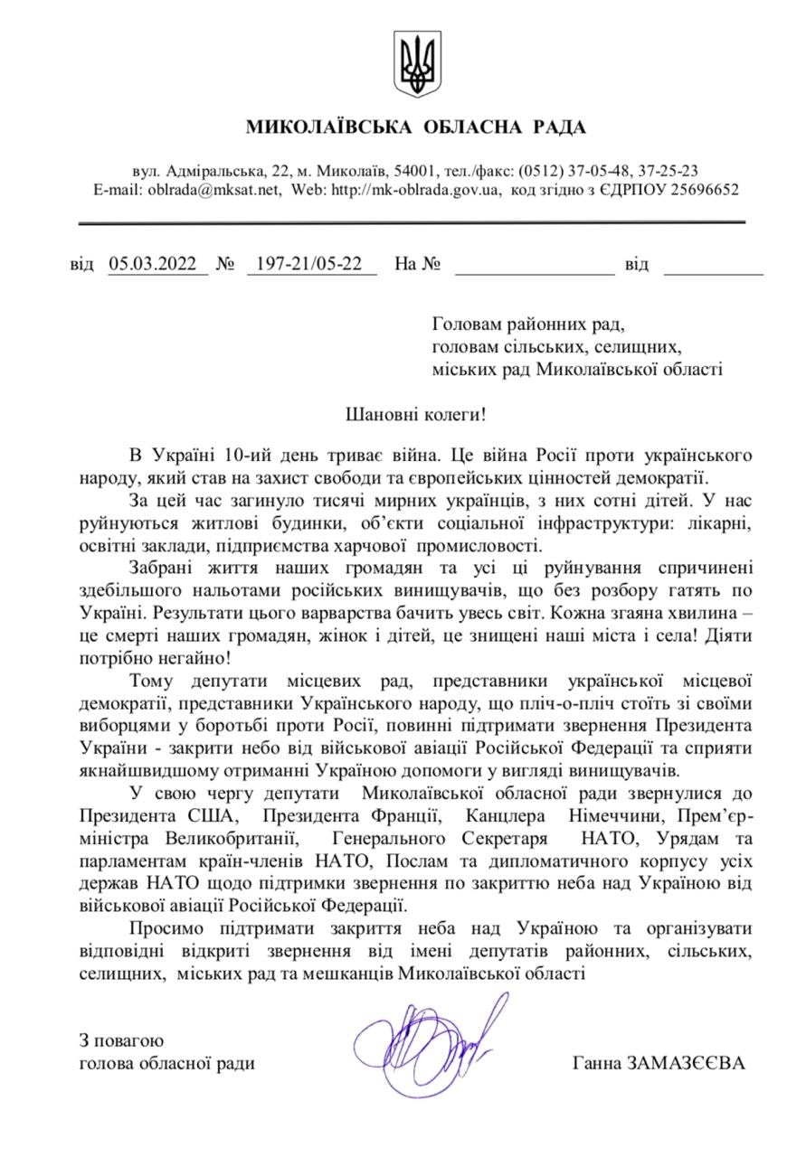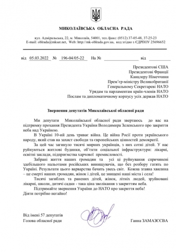 19:10 Глава Николаевского областного совета Анна Замазеева от имени местных депутатов обратилась к Президенту СШУ, премьер-министру Великобритании, канцлеру Германии, президенту Франции, генеральному секретарю НАТО, а также странам-членам НАТО с призывом закрыть небо над Украиной.