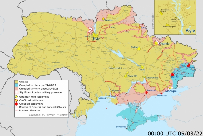 11:13 Карта боевых действий в Украине состоянием на 10-й день войны, 05.03.22. Как видим, блицкриг не удался, ни один крупный город, за исключением Херсона, не захвачен. Более того, есть ощущение, что жители Херсона сейчас голыми руками наваляют оккупанту.
