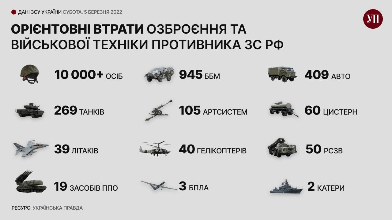 Вот ориентировочные боевые потери противника за время вторжения (с 24 февраля по 5 марта):
