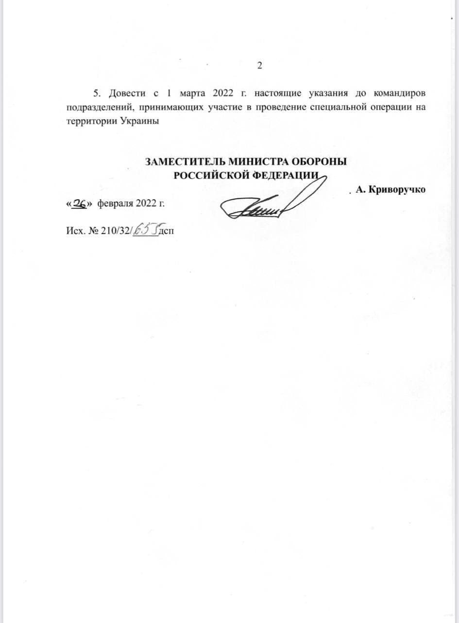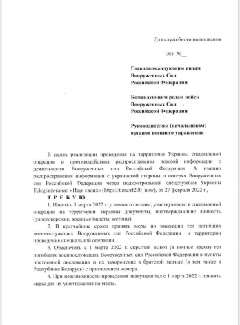 12:18 Нардеп Алексей Гончаренко показал приказ из Минобороны РФ. С 1 марта «освободителей» забрасывают в Украину без документов и жетонов, чтобы их личность не смогли установить или опознать через сервис «Ищи своих». Также при невозможности эвакуации тел, приказано уничтожать их на месте.