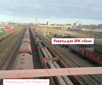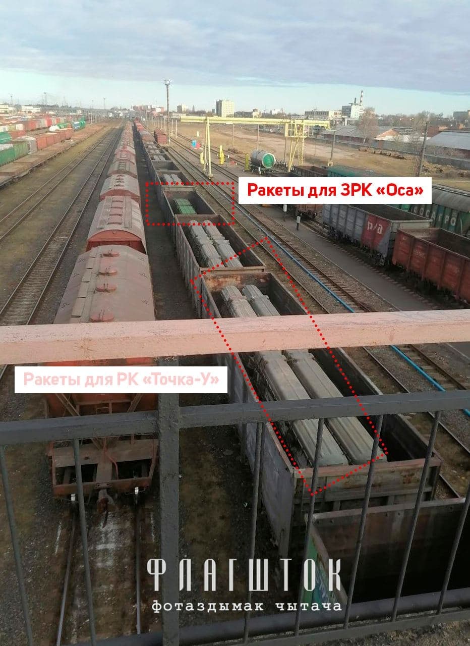 11:41 На ЖД-станцию «Гомель-Нечётный» в Беларуси привезли ракеты для РК «Точка-У» и ЗРК «Оса», сообщает белорусское издание Флагшток. На фото видны коробки, в длинных серых находятся ракеты для тактического ракетного комплекса «Точка-У», а в квадратных зелёных – для зенитно ракетного комплекса «Оса».