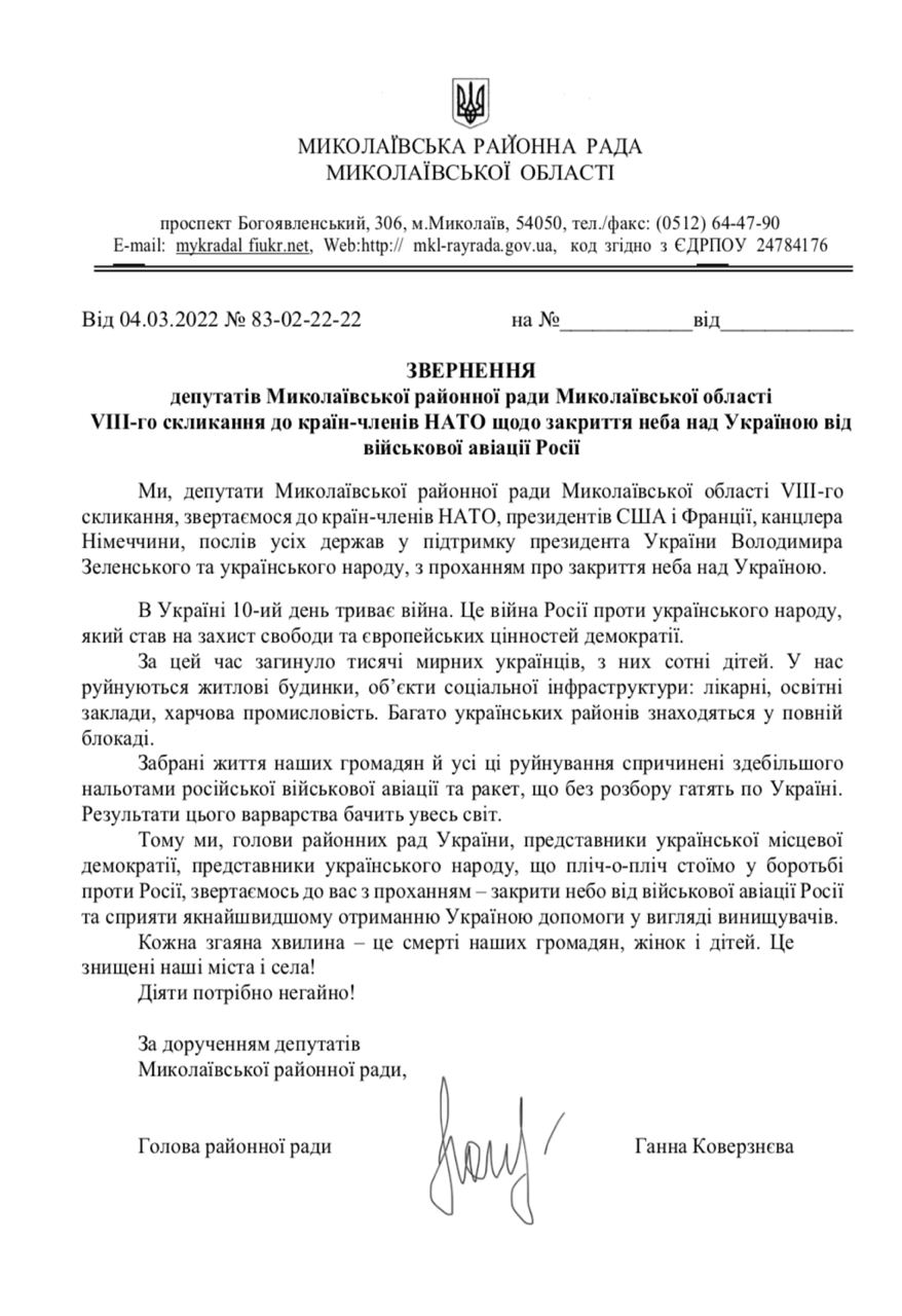 — Николаевцы активно приобщаются к сбору подписей под обращением от общества о закрытии неба над Украиной, чтобы вражеские самолеты и ракеты не могли атаковать наши школы, больницы, детские сады, мирные города и поселки, — пишет политик.