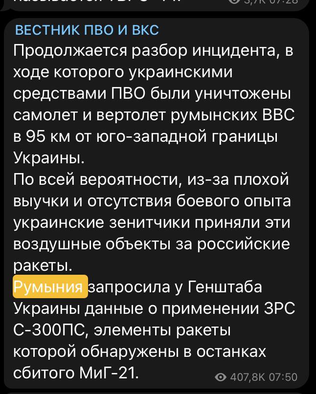 НикВести перепроверили последние сводки с сайтов Минобороны Румынии, Военно-Воздушных сил Румынии, ключевых медиа страны (Digi24, EVZ), и там никаких обвинений в адрес Украины, что украинская ракета сбила румынский истребитель.