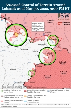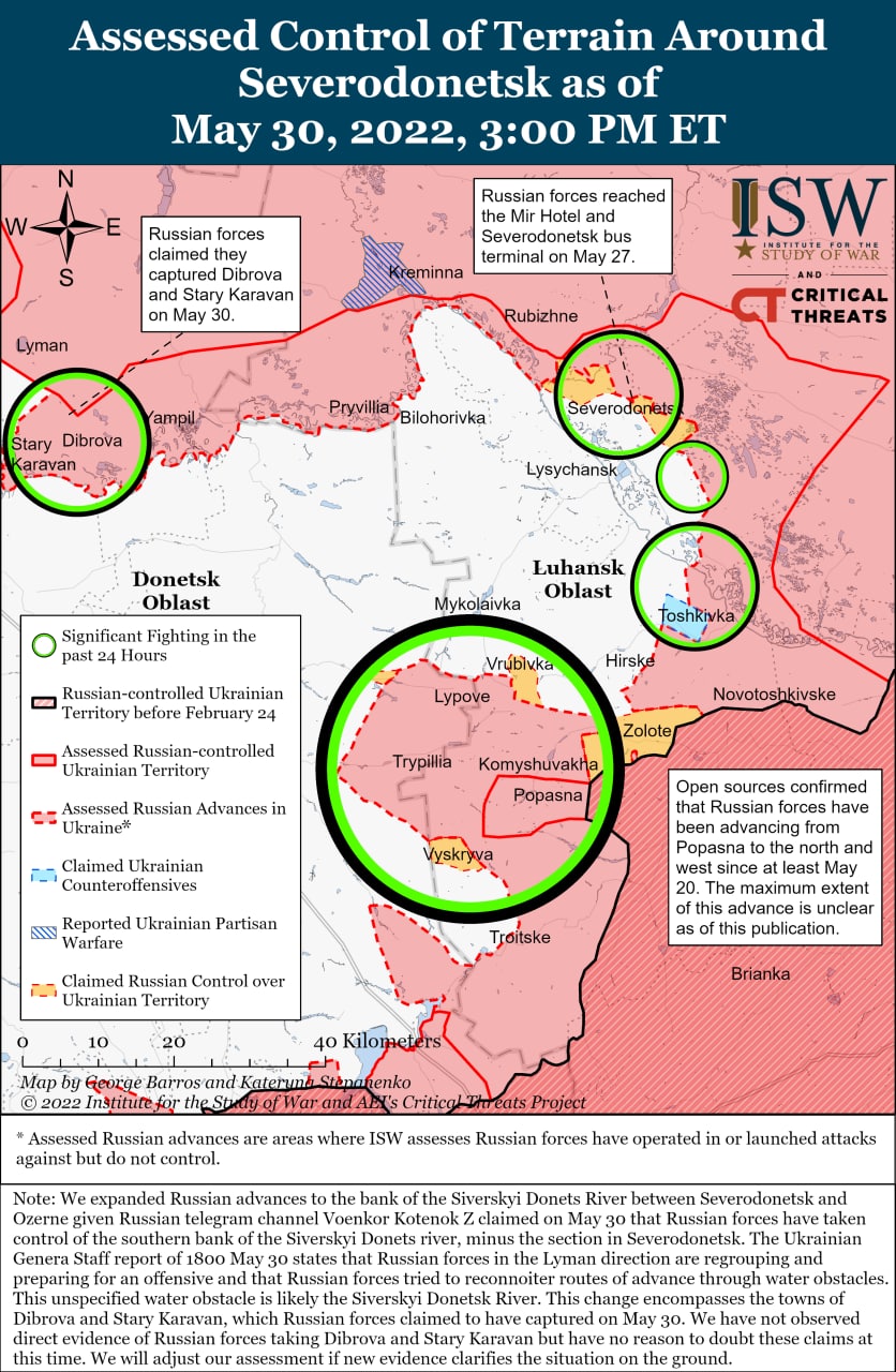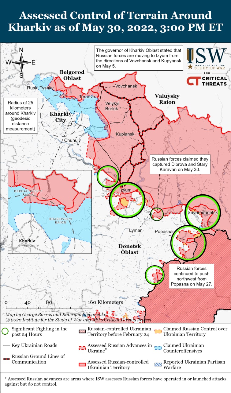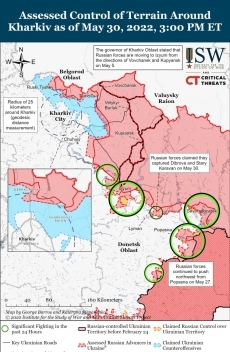 Так, по данным института, российские войска продолжали постепенно захватывать районы Северодонецка, но еще не полностью окружили город. Силы РФ сосредоточились на перегруппировке под Изюмом для возобновления наступления на Славянск и Барвинково.