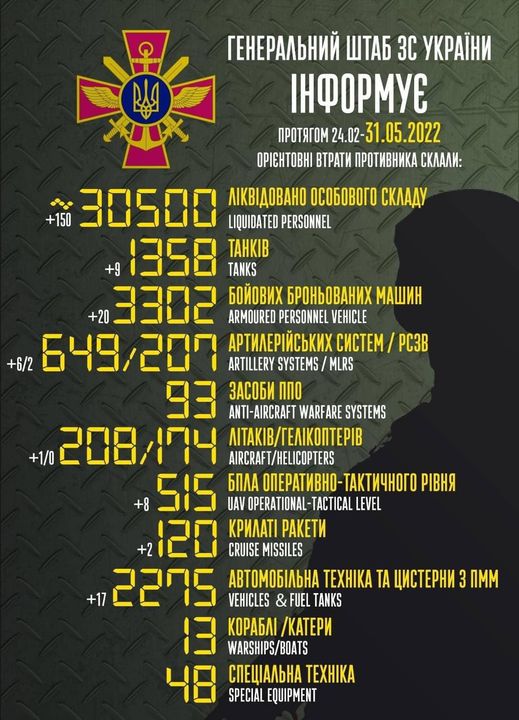 10:32 Общие боевые потери противника с 24 февраля по 31 мая