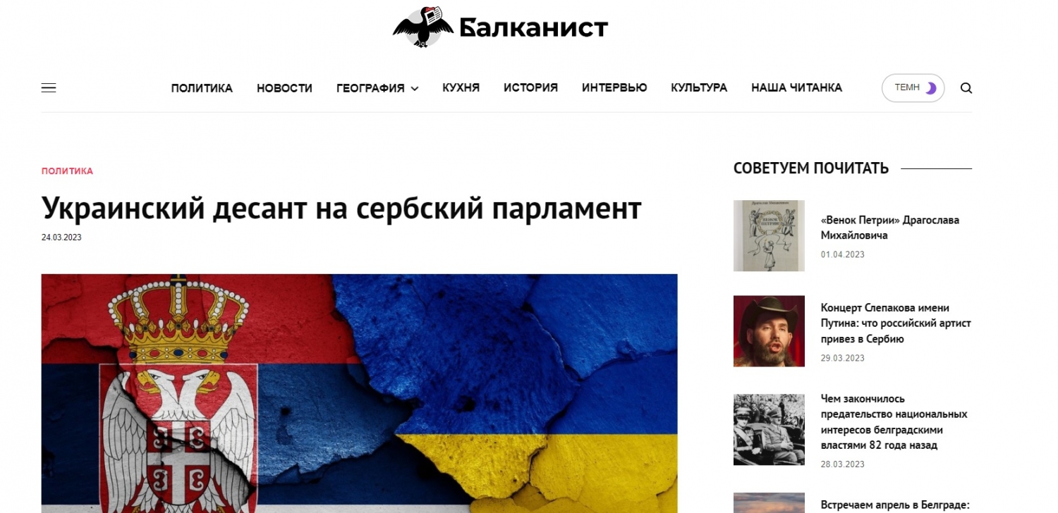 Про це йдеться у статті «Український десант на сербський парламент», опублікованій порталом Балканіст. Дане ЗМІ є одним із рупорів російської пропаганди в Сербії.