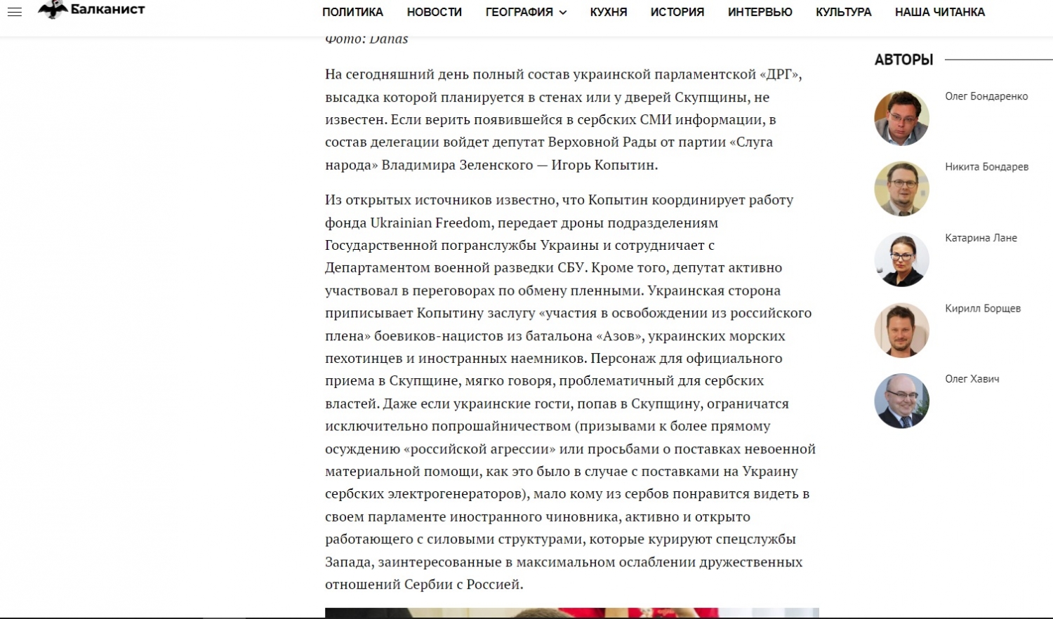 «Українська сторона приписує Копитіну заслугу «участі у визволенні з російського полону» бойовиків-нацистів з батальйону «Азов», українських морських піхотинців та іноземних найманців. Персонаж для офіційного прийому у Скупщині, м'яко кажучи, є проблематичним для сербської влади. Навіть якщо українські гості, потрапивши до Скупщини, обмежаться виключно жебрацтвом (закликами до більш прямого засудження «російської агресії» або проханнями про постачання невоєнної матеріальної допомоги, як це було у випадку з постачаннями на Україну сербських електрогенераторів), мало кому з сербів сподобається бачити в своєму парламенті іноземного чиновника, який активно і відкрито працює з силовими структурами, які займаються спецслужбами Заходу, зацікавлені в максимальному ослабленні дружніх відносин Сербії з Росією», — йдеться у статті.