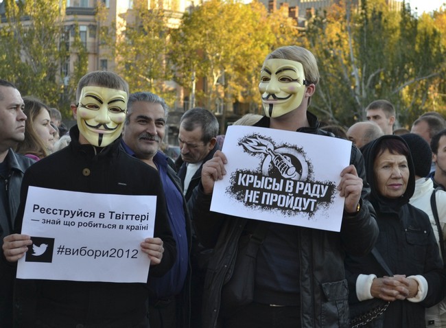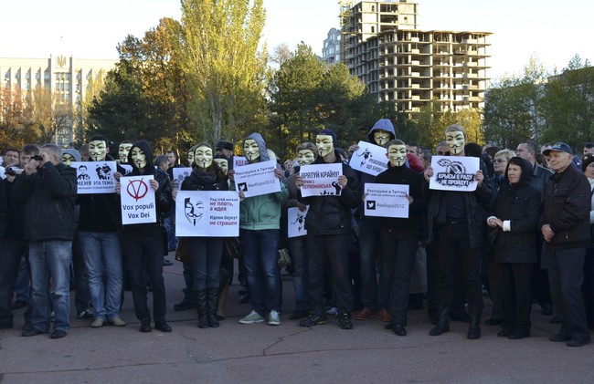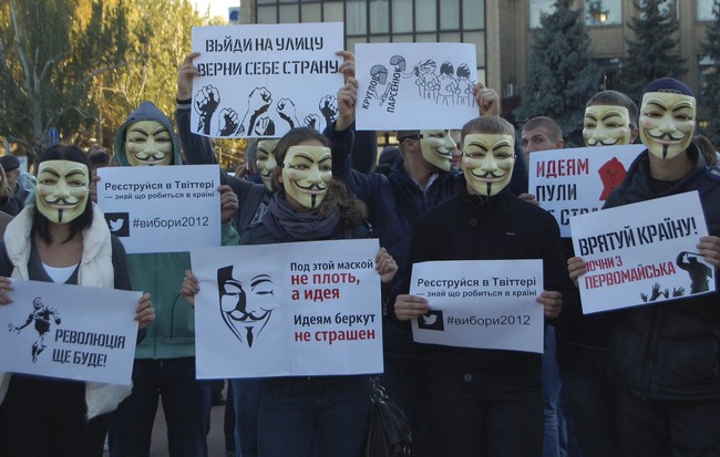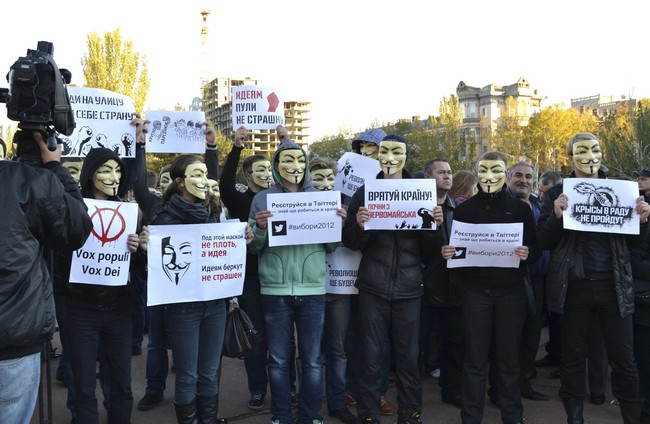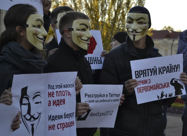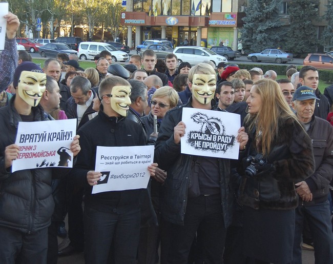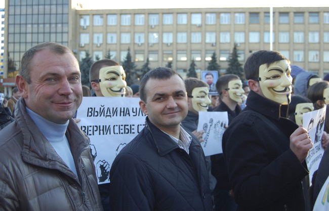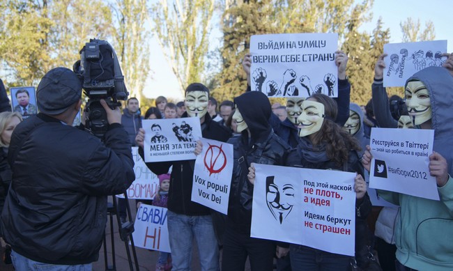 Около 20-ти молодых людей в масках пришли поучаствовать в митинге за отставку губернатора Николая Круглова и главы МВД области Валентина Парсенюка, который состоялся 7 ноября в 15:00 на площади Ленина в Николаеве.