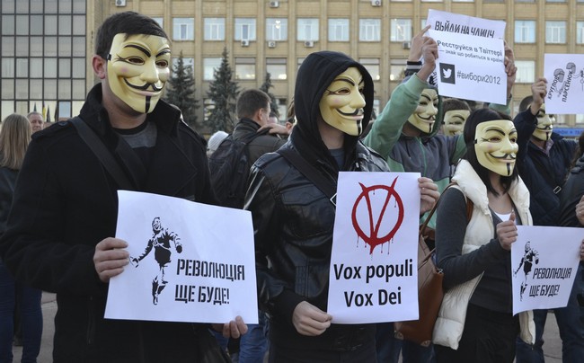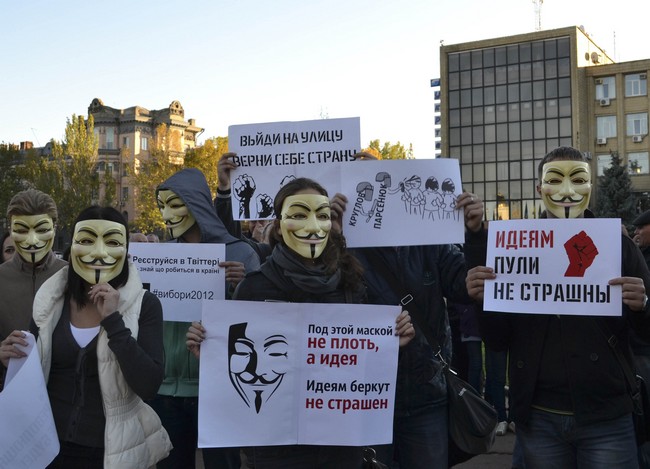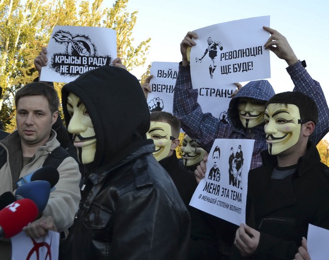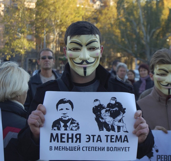 На митингующих была одета маска Гая Фокса – знаменитого участника Порохового заговора (1605 года), имя которого связывают с попыткой взорвать здание английского парламента и свергнуть шотландского короля Якова I. Традиция надевать подобную маску на митинги стала популярной благодаря фильму «V значит Vendetta».