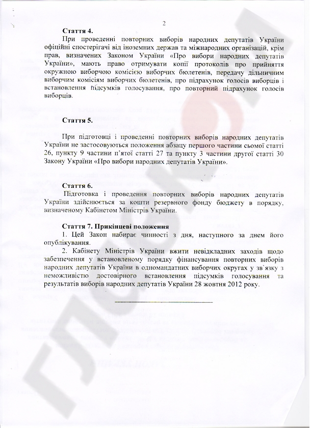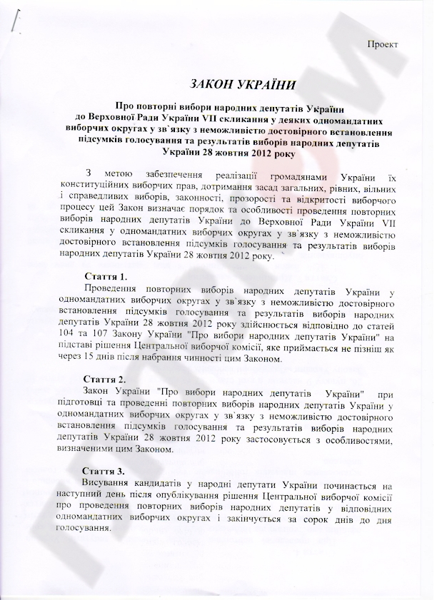Называется он: «О повторных выборах народных депутатов Украины в Верховную Раду VII созыва в некоторых одномандатных избирательных округах в связи с невозможностью достоверного установления итогов голосования и результатов выборов народных депутатов Украины 28 октября 2012 года».