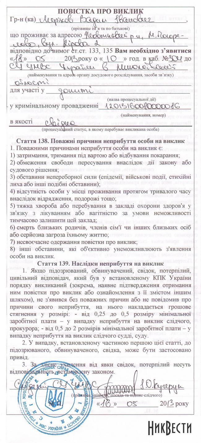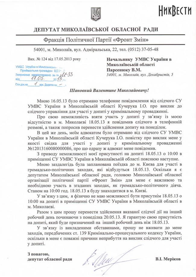 Ввиду этого, Вадиму Мерикову пришлось направить обращение на имя начальника УМВД в Николаевской области Валентина Парсенюка с просьбой перенести дату допроса и не применять к нему последствия неявки, согласно ст. 139 КПК Украины.