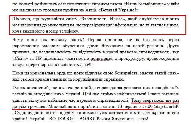 Так, по словам оппозиционера, подобные поддельные обращения - это не только преступление, ведь была подделана его подпись, но и жалкая провокация, попытка сорвать проведение 13 июня акции «Вставай, Украина!» в Николаеве.