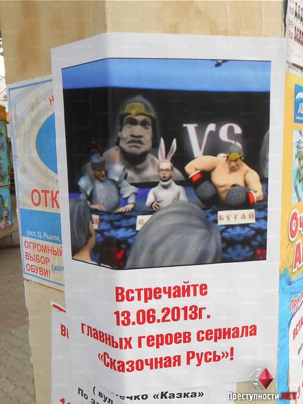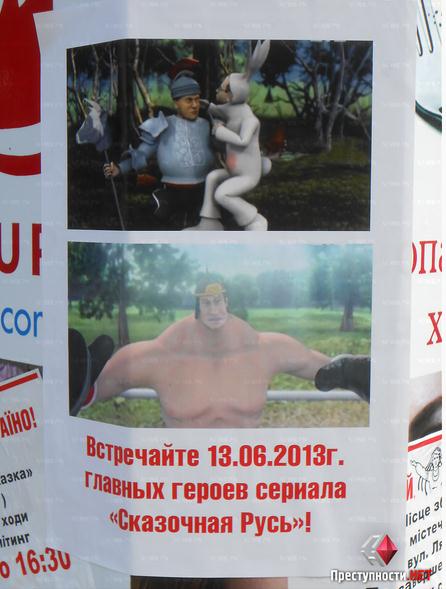 На другой из листовок изображены герои мультфильма «Сказочная Русь» и подпись «Встречайте 13.06.2013 главных героев сериала «Сказочная Русь!».