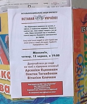 По центральной части Николаева развешены листовки, в которых николаевцев приглашают принять участие в оппозиционной акции «Вставай, Украина!» в 19.00, тогда как согласно официальным анонсам, оппозиционеры планируют начать акцию в 17.00.