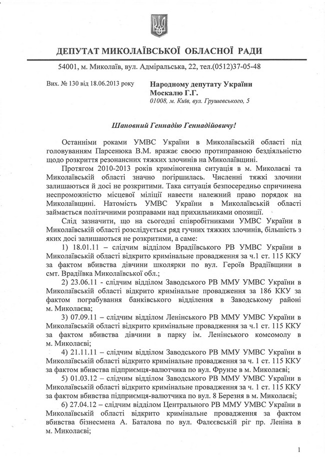 В своем письме депутаты указывают на бездействие правоохранительных органов и неспособность областного управления милиции навести должный правопорядок на Николаевщине.