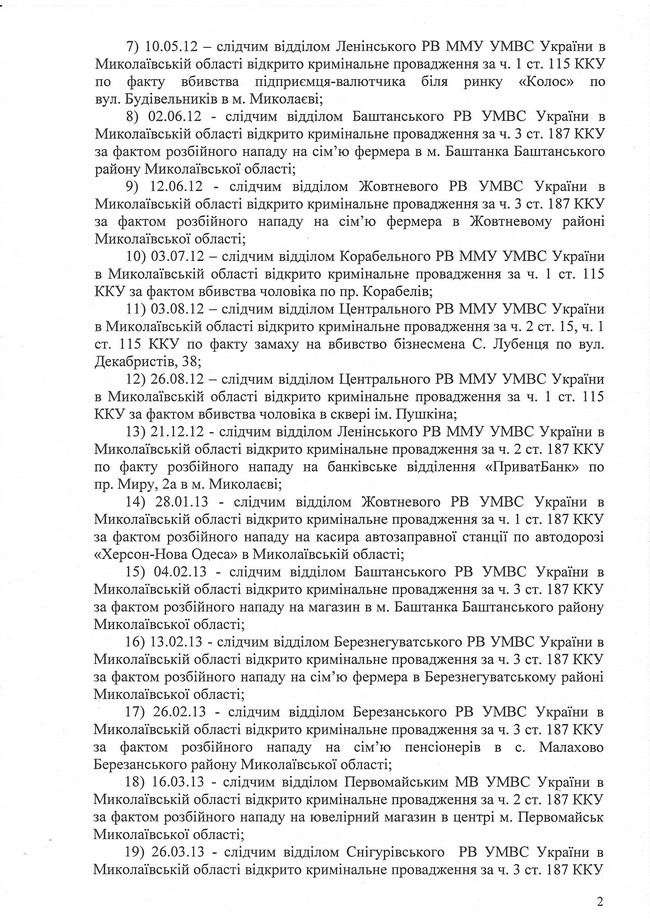 3 мая 2013 года - следственным управлением УМВД Украины в Николаевской области открыто криминальное производство по п. 1 ч. 2 115 ККУ по факту убийства трех мужчин возле городской свалки в Николаевском районе Николаевской области.