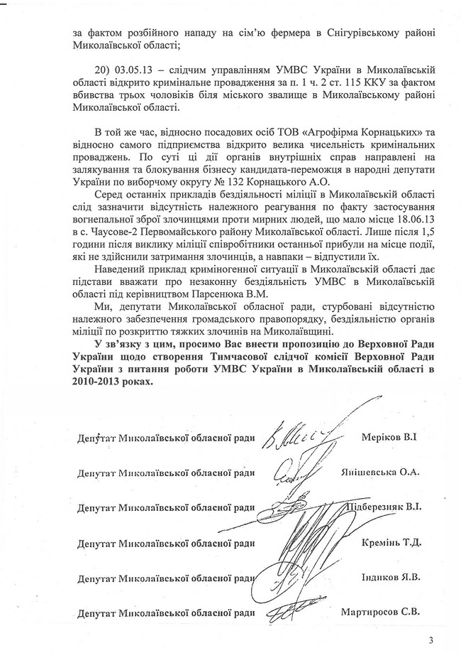 Ввиду того, что депутаты Николаевского областного совета обеспокоены отсутствием надлежащего обеспечения общественного правопорядка, бездействием органов милиции по раскрытию преступлений на территории Николаевщины, они предлагают парламенту создать Временную следственную комиссию по вопросам работы органов внутренних дел в Николаевской области с 2010 по 2013 годы.