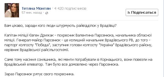 Она объяснила это тем, что Врадиевский район – родина начальника облУМВД Валентина Парсенюка, который работал здесь начальником Врадиевского РО, а до того парторгом колхоза "Победа", заместителем председателя колхоза "Украина" и руководителем Врадиевской райсельхозхимии.
