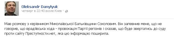 В тот же день Михаил Соколов в телефонном разговоре с координатором «Спільной справи» Александром Данилюком заявил о том, что не говорил ничего подобного и пообещал подать в суд на николаевское издание Преступности.НЕТ, которое опубликовало эту информацию.