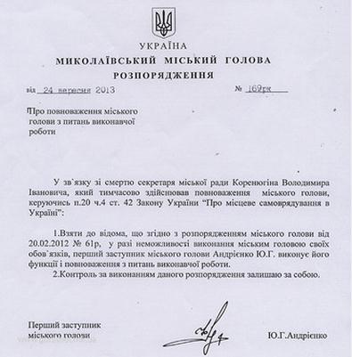 Сегодня Юрий Андриенко подписал соответствующее распоряжение, в связи со скоропостижной кончиной временно исполняющего обязанности мэра Николаева Владимира Коренюгина.