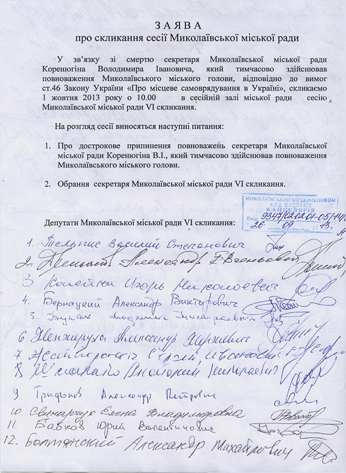 Заявление о созыве сессии подписало 52 депутата, в частности: Андрей Агнянников, Юрий Антощенко, Юрий Бабков, Андрей Баев, Максим Бекало, Михаил Беркан, Александр Бернацкий, Александр Болтянский, Валерий Будак, Людмила Булах, Валерий Буркун, Николай Вороненко, Юрий Гранатуров, Олег Грипас, Александр Демьянов, Виктор Дробот, Тамара Дубинец, Анатолий Дюмин, Владимир Евтушенко, Николай Еропунов, Сергей Жайворонок, Александр Женжеруха, Александр Жолобецкий, Валерий Калашников, Вячеслав Карцев, Игорь Качный, Игорь Копейка, Олег Крисенко, Дмитрий Куклинский, Александр Курченко, Светлана Лопатина, Юрий Мостовой, Сергей Мотуз, Александр Омельчук, Александр Румянцев, Елена Свинарчук, Василий Тельпис, Максим Терещенко, Олег Топчий, Александр Трифонов, Владимир Худяков, Алексей Целищев, Владимир Ципляев, Андрей Чеканович, Алла Черноморченко, Инга Шаповалова, Анатолий Шмалько, Сергей Шульгач, Татьяна Щедрова, сообщили в пресс-службе Николаевского городского совета.