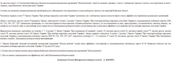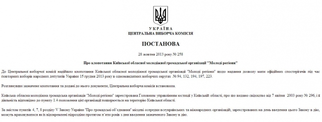 В постановлении сообщается, что «Молодые регионы» подавали ходатайство о получении разрешения иметь официальных наблюдателей во время повторных выборов во всех 5 мажоритарных округах №№ 94, 132, 194, 197, 223.