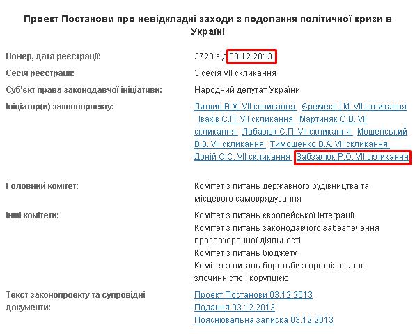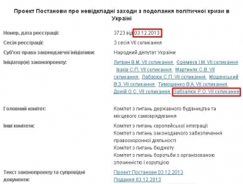 На сайте Верховной Рады говорится о том, что проект постановления «О неотложных мероприятиях по предотвращению политического кризиса в Украине» был зарегистрирован 3 декабря группой народных депутатов: Забзалюк, Еремеев, Литвин, Ивахив, Мартиняк, Лабазюк, Мошенский, Тимошенко, Доний.