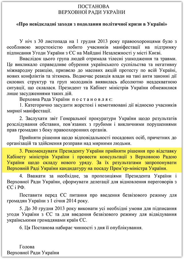 Третьим пунктом проекта постановления предусмотрено рекомендовать президенту принять решение об отставке Кабинета министров Украины и провести консультации с парламентом относительного нового состава правительства.
