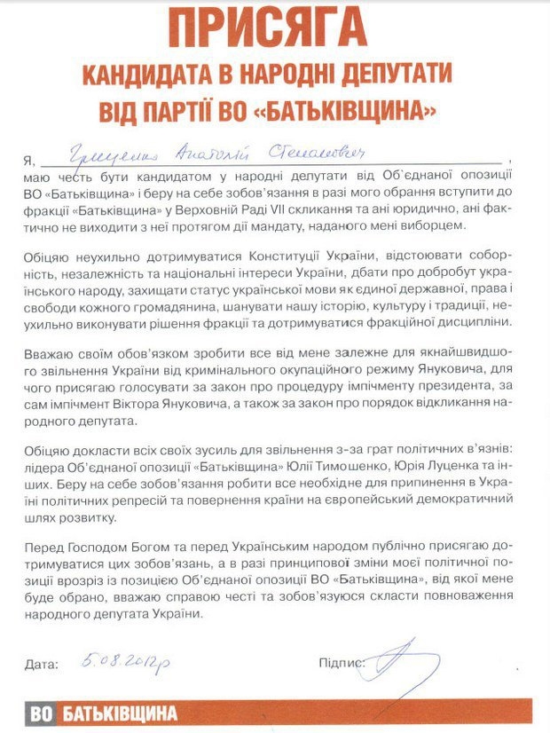 На сайте партии "Батькивщина" обнародована фотокопия соответствующей присяги.