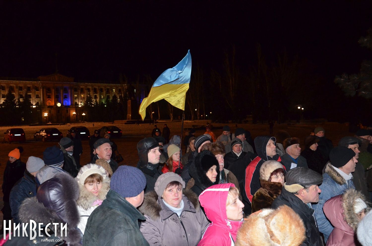 На акцию собралось более 500 человек. Сначала на площади Ленина активисты зажгли свечи в память о погибших в Киеве протестующих, после чего колонна николаевцев под государственными флагами Украины, а также партий УДАР и ВО "Свобода" прошлась по Советской, свернула на проспект Ленина в сторону сквера Европы на улице Садовой.