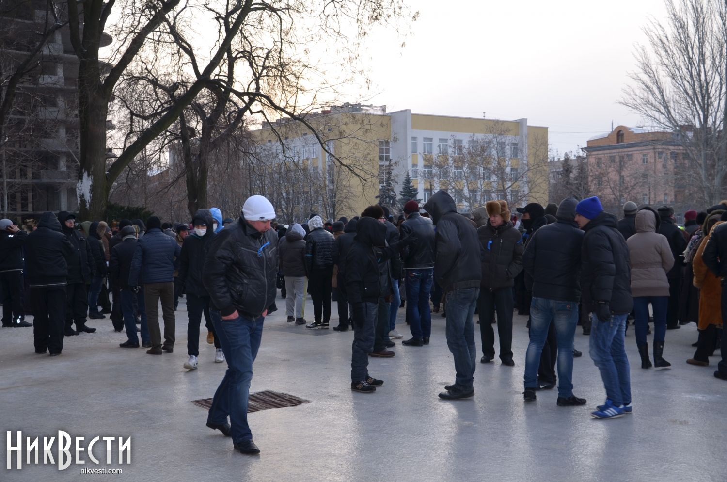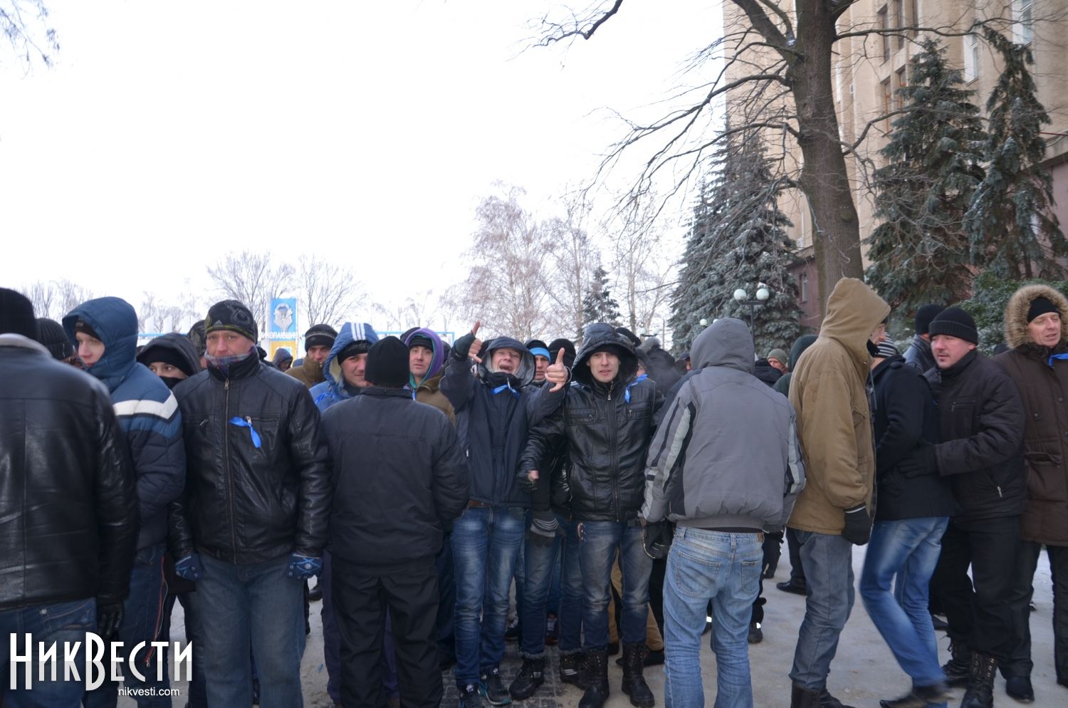 Как известно, сегодня, 25 января, около 400 сторонников Партии регионов в Николаеве вышли под здание Николаевской ОГА и весь день митинговали там в ожидании возможного штурма. Отметим, что большую часть митингующих составляли молодые люди спортивного вида. Все участники скандировали «Мы – регионы, нас миллионы!», а также «Фашизм не пройдет!».