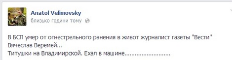 "Умер от огнестрельного ранения в живот журналист газеты "Вести" Вячеслав Веремий. Титушки на Владимирской. Ехал в авто", - написал его коллега Анатолий Велимовский.