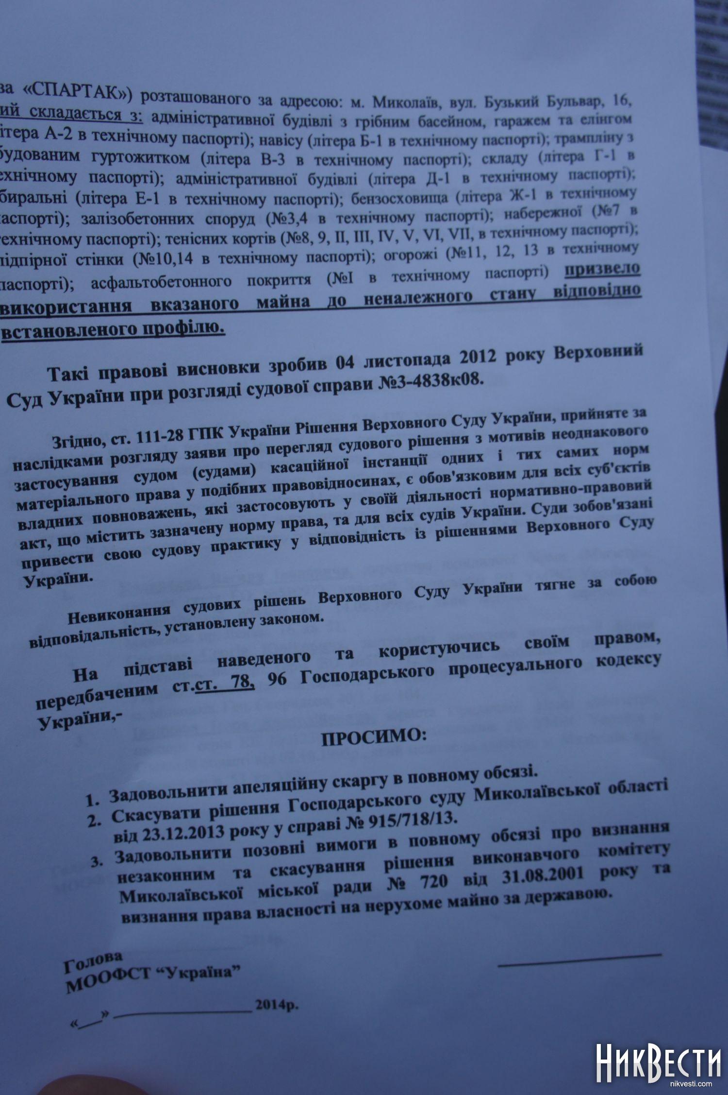 Напомним, что 22 ноября 2012 года сессия Николаевского городского совета рассмотрела проект решения «О продаже земельных участков гражданам, юридическим лицам и внесение изменений в решения Городского совета», который предполагал продажу земельного участка спортбазы «Спартак» ООО «Спортивно-оздоровительный комплекс «Украина» за 2 миллиона гривен. Депутаты тогда за это решение не проголосовали, во многом ввиду давления общественности.