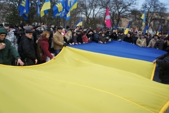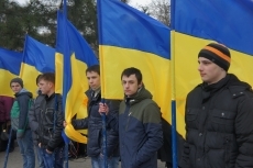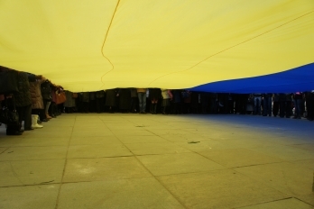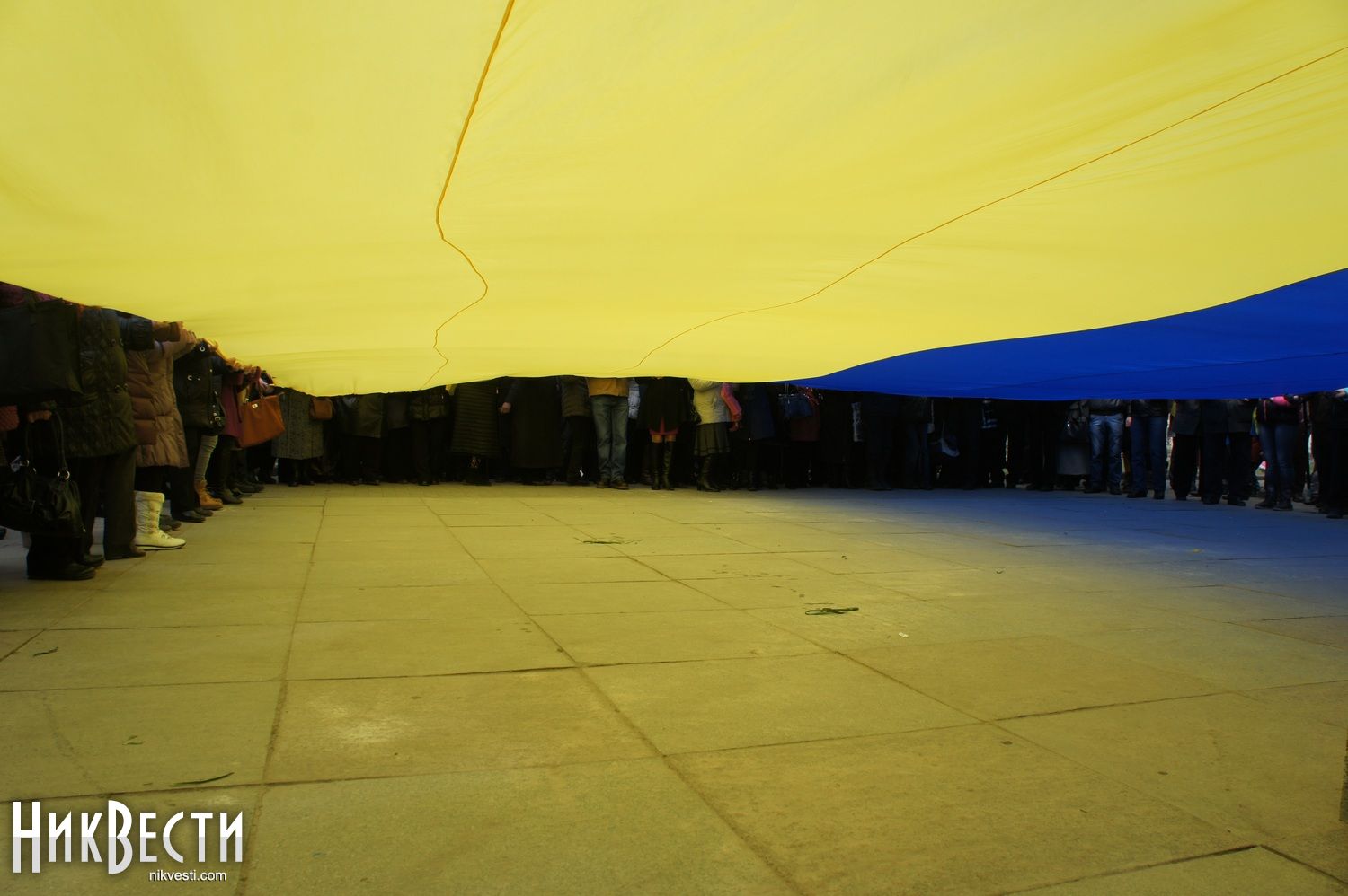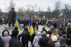 В конце митинга все присутствующие возложили цветы к памятнику Тараса Шевченко и развернули огромный государственный флаг Украины.