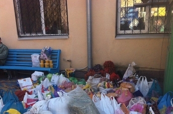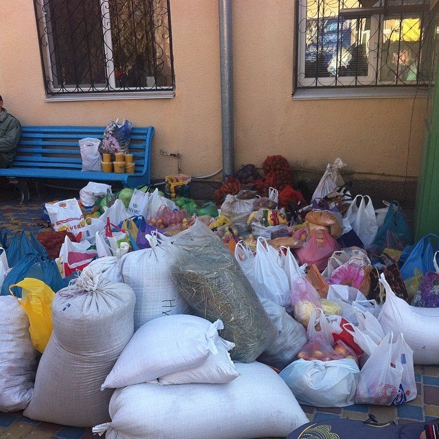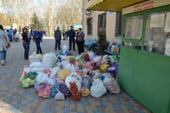 При этом николаевцы несли с собой пакеты с различными продуктами, в частности, крупы, фрукты, овощи, мясо, оставляя их у входа контролерам. Таким образом там постоянно образовывалась огромная куча пакетов в продуктами питания.