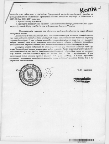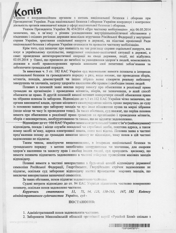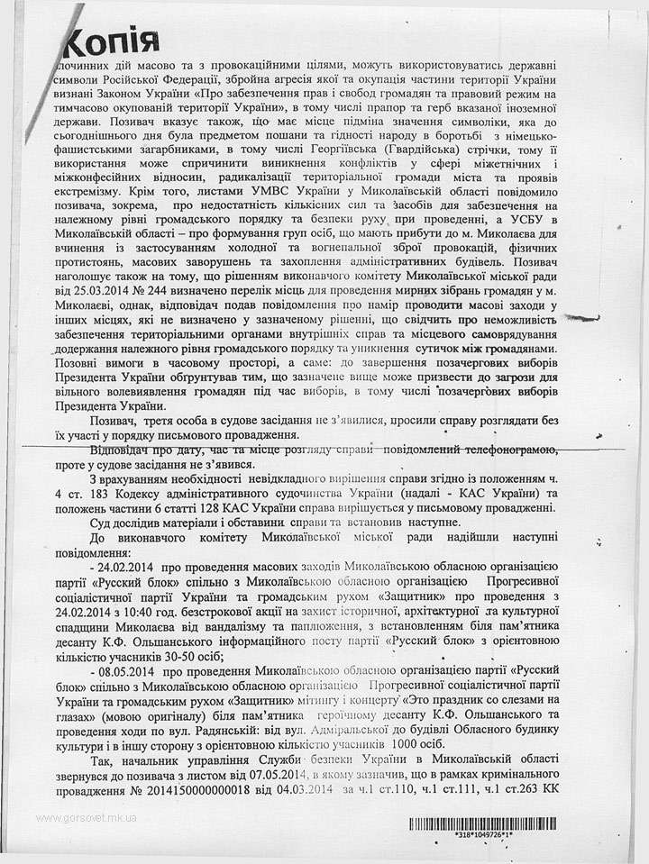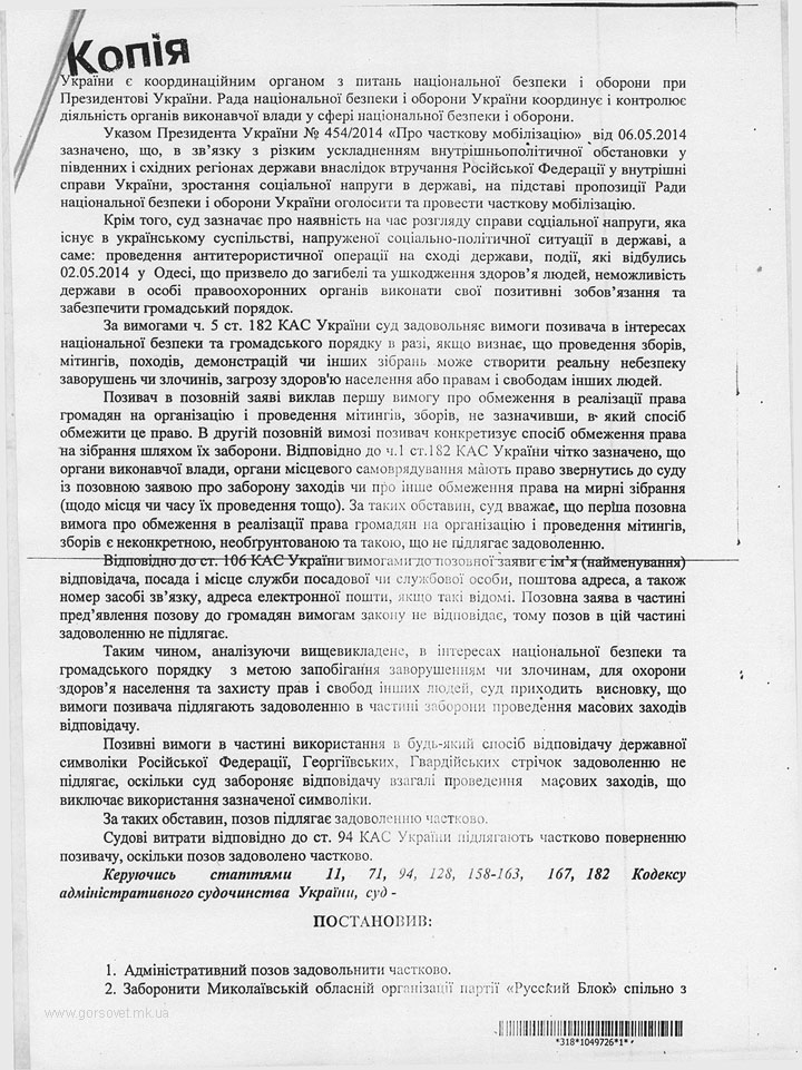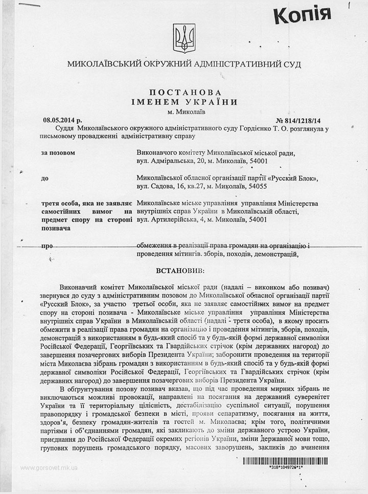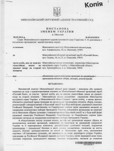 Окружной административный суд Николаевской области удовлетворил иск исполкома Николаевского городского совета к организаторам пророссийских митингов, таким образом запретив им проводить акции с 8 по 25 мая.
