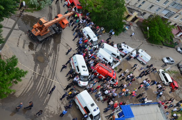 На данный момент там находится очень много милиции, несколько автомобилей Скорой помощи и спасатели. Кроме того, во дворе дома находится около двух тысяч человек.