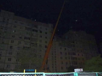 0:42. Спасателя на кране подняли к разрушенной квартире на 7 этаже, где, по их мнению, находится пострадавшая.