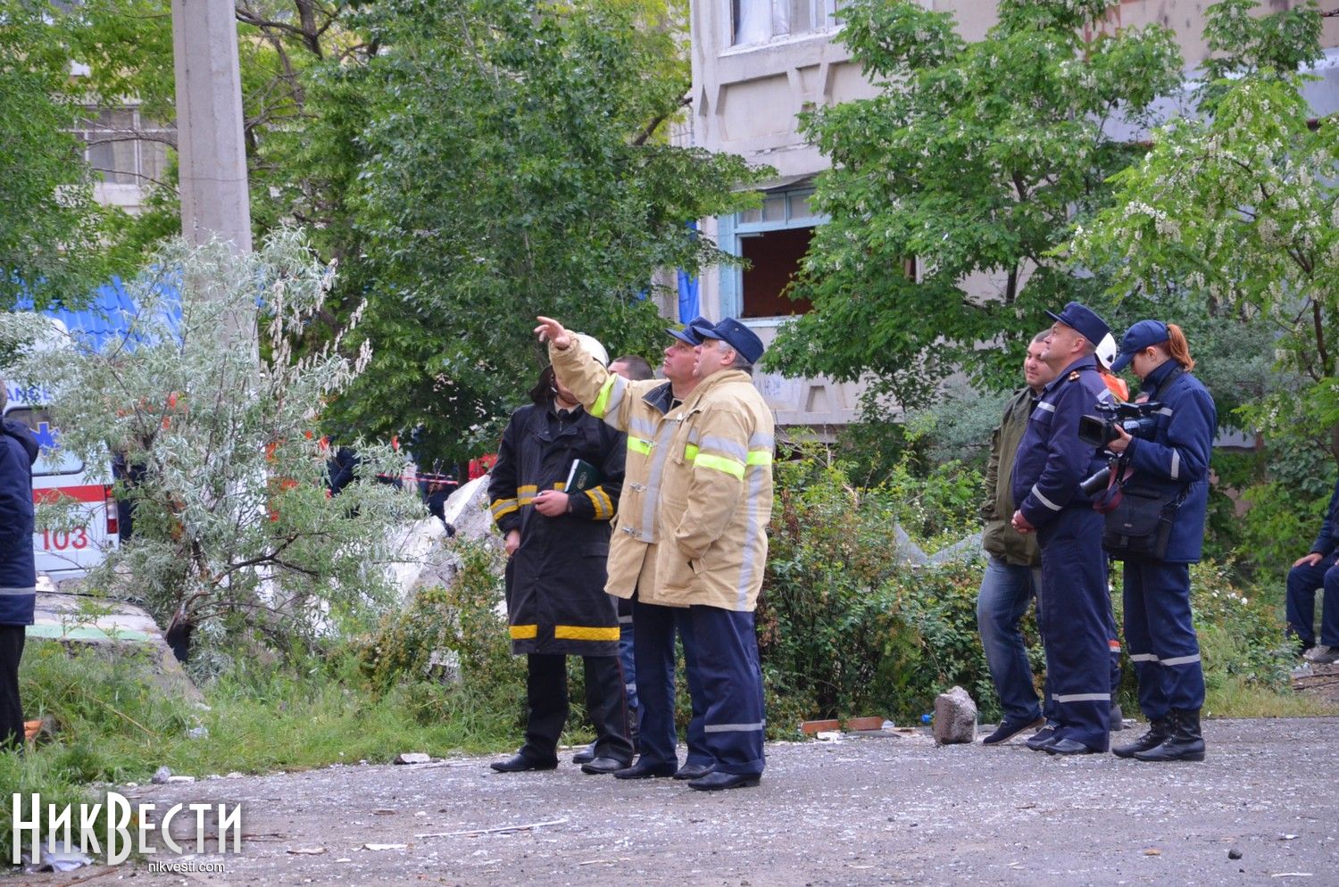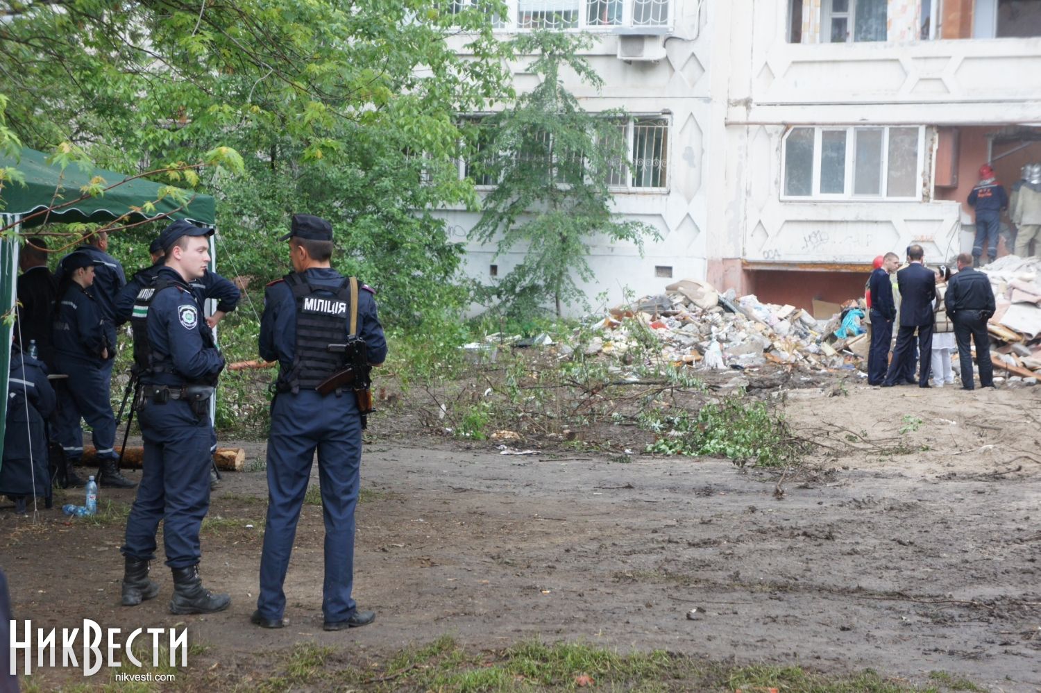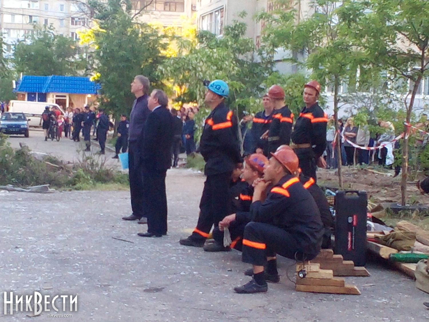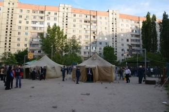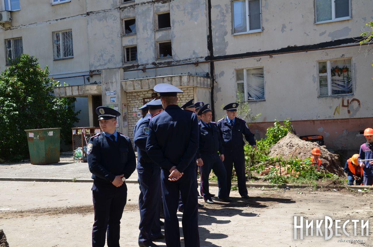 21:50. Во дворе дома, в котором произошел взрыв, председатель Николаевской ОГА Николай Романчук провел закрытое заседание по вопросам ликвидации последствий трагедии.
