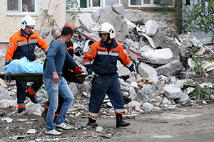 14:12 Спасатели пытаются эвакуировать пожилых людей, живущих в квартире, смежной со взорванной