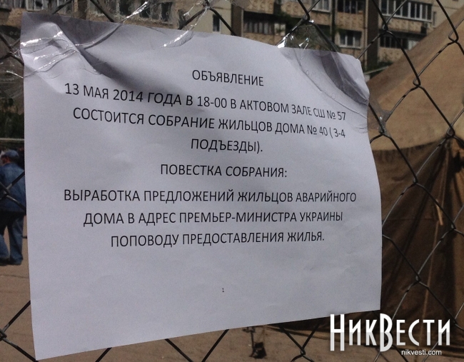 17:17. Жильцам 3 и 4 подъездов напомнили, что в 18 часов их ждут в здании школы №57, где они проведут собрание с выработкой предложений премьер-министру Арсению Яценюку. Ожидается, что на встречу придут представители правоохранительных органов и ГСЧС.